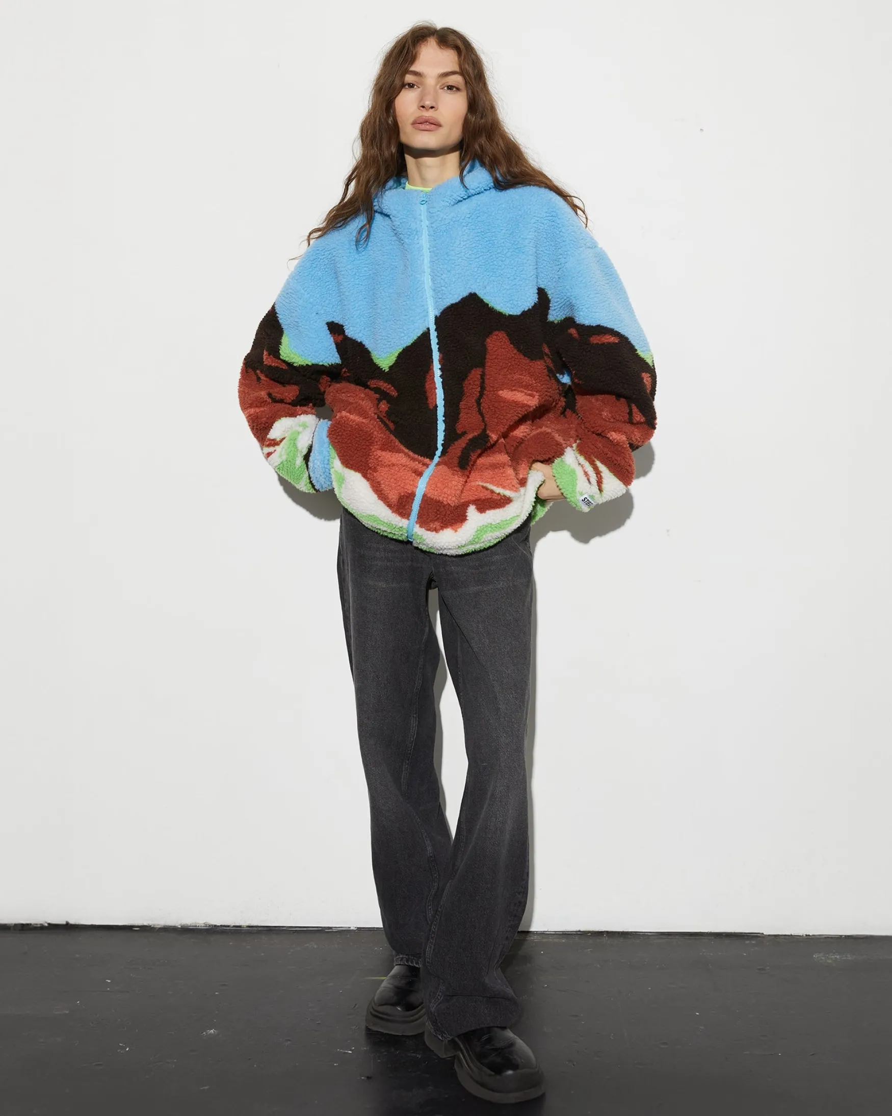 De Bor Jas is een oversized teddyjack met capuchon en een all-over Balkan landschap print. Deze warme en stijlvolle jas voegt een unieke touch toe aan je wintergarderobe.